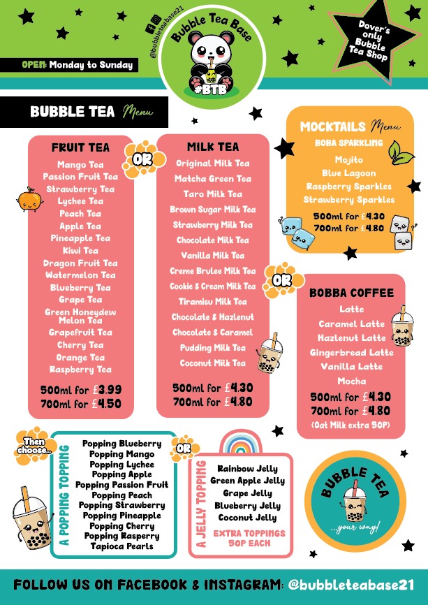 Welcome to Bubble Tea Base, Dover’s cozy cafe tucked away on Church Street. This charming hub offers an impressive menu that combines delightful bubble tea with satisfying dim sum. Each cup of their milk tea—from the Original to the indulgent Creme Brulee and Tiramisu varieties—boasts real milk, ensuring a creamy freshness absent in many competitors.